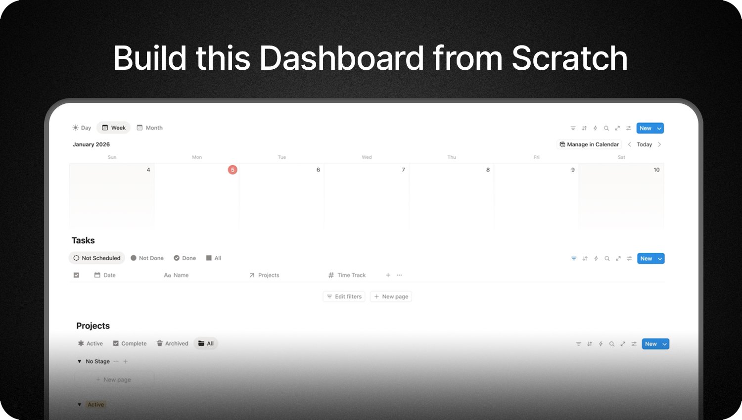 This module shows you how a complete productivity system is built from the ground up. Starting from a blank page, you’ll build my Workbench OS: a simple but powerful workspace with tasks, projects, notes, and a calendar that all connect and work together.